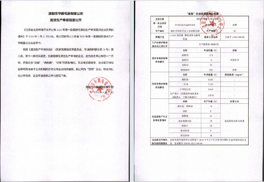 建设项目清洁生产审核信息公开(溧阳市华鹏电器有限公司2026年)